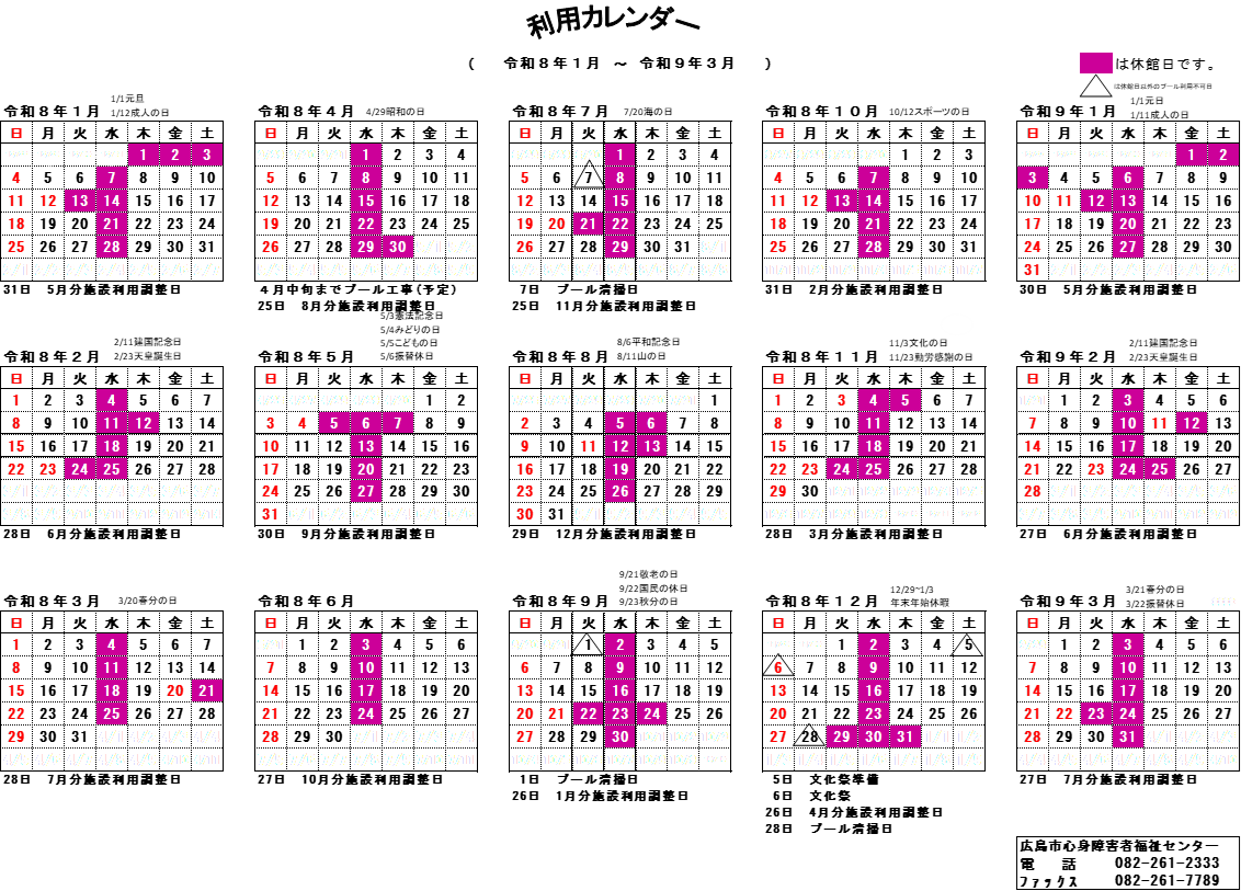 ●広島市心身障害者福祉センター(デイサービスを除く)の利用カレンダー● 令和8年7月7日(火)、令和8年9月1日(火)、令和8年12月28日(月)の計3回は、プール清掃に伴い、プール施設のみ終日閉鎖します。 その他大会行事等により各施設で利用できない日がございます。詳しくは当センターまでお問合せください。
